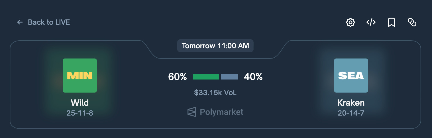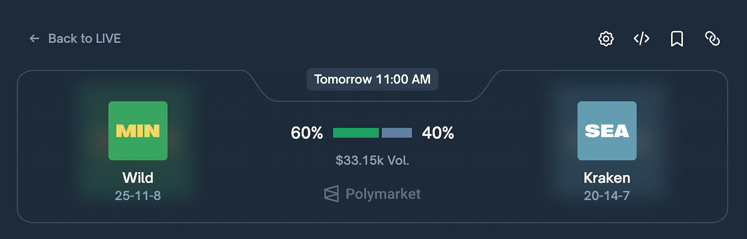 On January 9, 2026 is an NHL match between the Minessota Wild and the Seattle Kraken. The image below shows the current bet for 60% chance of winning for Wild. Each ‘Yes’ share costs $0.60.