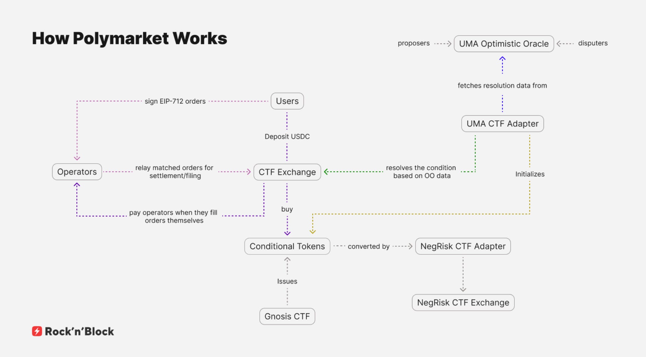 Polymarket order book is hybrid decentralized. This means it combines off-chain and on-chain parts. Users create orders off-chain, an operator matches them off-chain, and then triggers their execution via smart contracts. Shares are ERC-1155 tokens representing outcome positions, they are implemented using Gnosis’s Conditional Tokens Framework (CTF). USDC is used as collateral to mint and redeem shares.