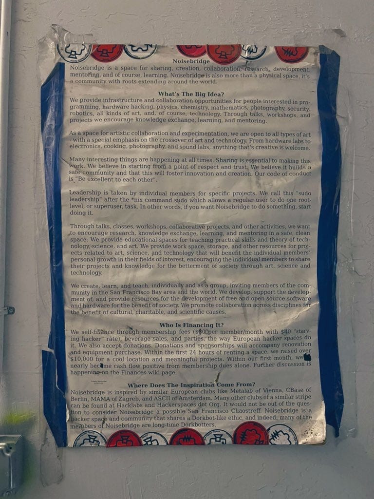 Observation: we can organize communities around causes we believe in to advance our own growth as technologists, agents, professionals and entrepreneurs. The maker space Noisebridge comes from a long line of community organized around technology, some organizations formed like this in Europe. The mission statement on the wall is very clear about what this place is about. I found it very inspiring and compelling. I have been attending this space every time I would come to visit SF, especially when I lived here last year. I am full of ideas about building coding, Ai tinkerer, indiehackers, robotics and other social meetups in this space, to help foster innovation.