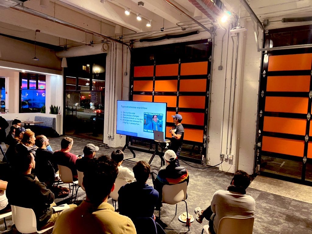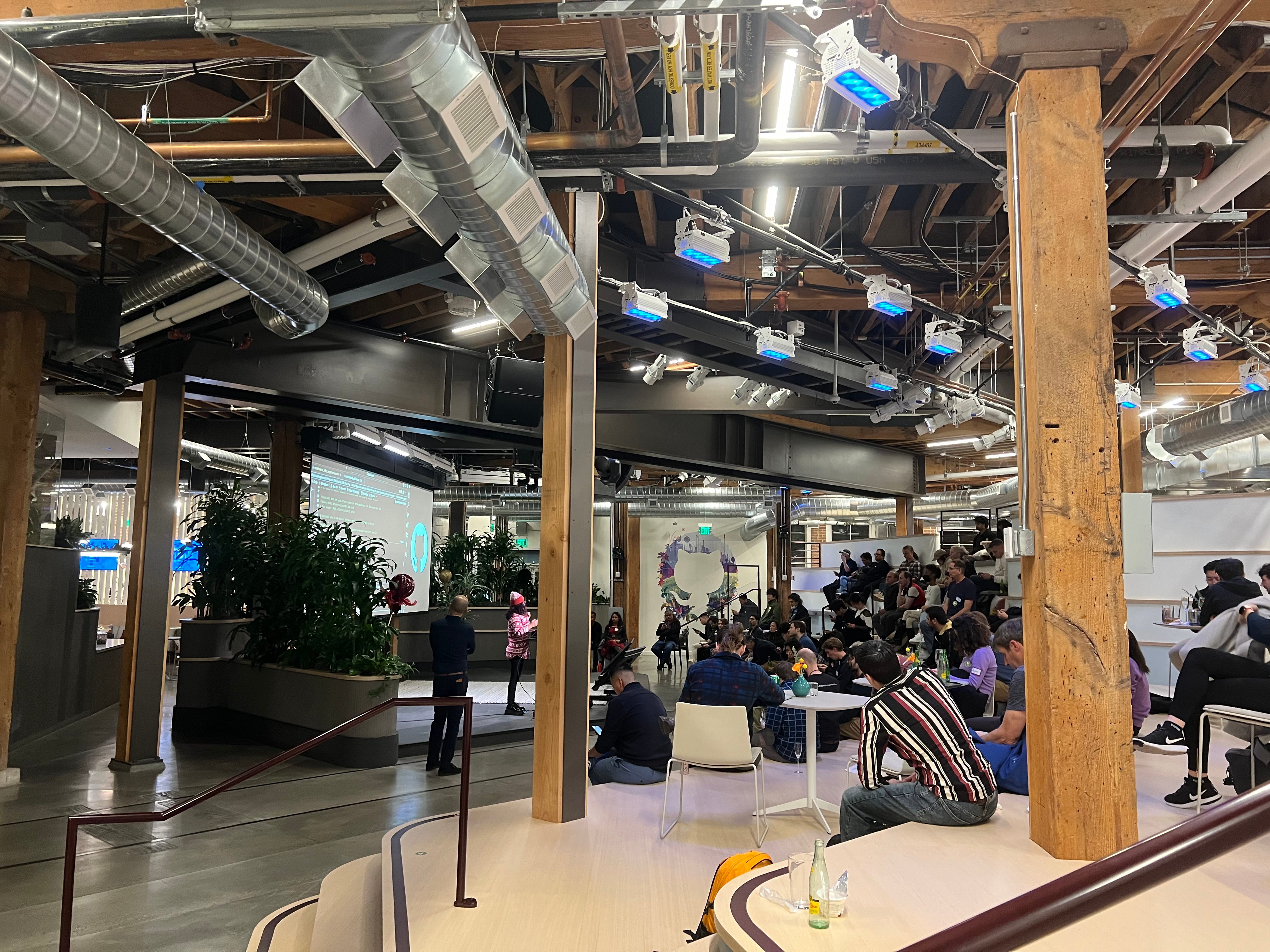 Going to meetups on the weekday, at GitHub office and Cloudflare. Conversations with other founders, one is making productivity app using science to improve cognitive performance and learning. Talks about new startup products in Ai and other tech.